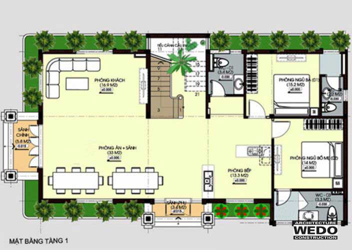 Công năng tầng 1 gồm: Sân xe hơi kết hợp cùng sân vườn cây xanh, phòng khách thông thoáng, phòng bếp có cửa thông gió, phòng ăn rộng rãi, 2 phòng ngủ và 2 phòng vệ sinh.