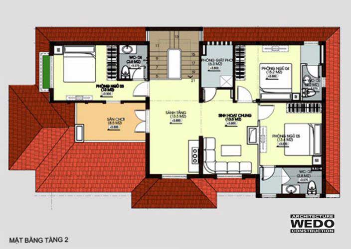 Công năng tầng 2 gồm: 3 phòng ngủ trong đó có 3 phòng vệ sinh riêng , phòng sinh hoạt chung cho cả gia đình, phòng giặt và phơi đồ, ban công đón gió thoáng đãng vào ngôi nhà.