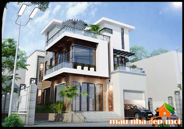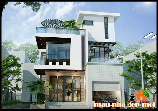 Phối cảnh mặt tiền mẫu thiết kế biệt thự 3 tầng mái bằng có gara để xe
