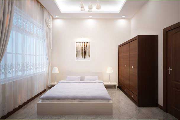 Một căn phòng ngủ không quá rộng nhưng cách thiết kế kiểu phòng cùng việc bày trí nội thất vẫn toát lên sự ấm cũng và thư giãn. Cách phối màu trang nhã phù hợp với những viên gạch lát hoa cương càng tô điểm thêm vẻ đẹp cho căn phòng.