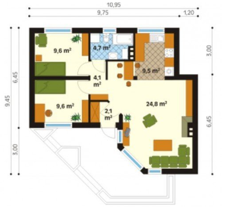 Ngôi nhà này được chia làm ba phân khu chính. Ở gian giữa trung tâm được lắp đặt cửa ra vào tiếp đến là phòng khách có diện tích rộng nhất trong nhà. Phía trong của phòng khách được bố trí một phòng ngủ có phòng vệ sinh khép kín bên trong. Phân khu thứ hai từ cửa nhìn vào phía bên trái được thiết kế với phòng bếp với một trái sảnh phụ cũng có diện tích rộng để cả gia đình ăn uống sinh hoạt ở đây. Góc trong của khu này sắp xếp hai phòng vệ sinh sử dụng chung cho cả gia đình. Và phía ngoài cùng là sân ban rông dài rộng để vui chơi hay cho gia chủ chăm sóc cây cảnh rất tự nhiên trong lành. Phân khu còn lại phía bên phải của ngôi nhà trước tiên là một phòng thờ của gia đình, phía trong cùng thêm một phòng ngủ. Có thể nói với diện tích khá khiêm tốn nhưng nhờ sự thiết kế thông minh khéo léo đã giúp cho ngôi nhà cấp 4 9x11 được sử dụng tối đa công năng với đầy đủ các phòng, tiện nghi cần thiết cho các thành viên trong gia đình thoải mái sinh hoạt và sử dụng