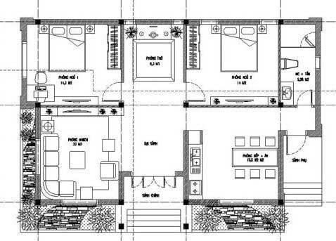 Các công năng bao gồm: phòng khách, phòng bếp + ăn, 1 phòng thờ, 2 phòng ngủ và 1 phòng vệ sinh