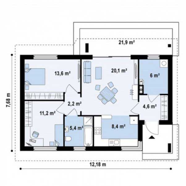 -Ví dụ không gian trong nhà cấp 4 nhỏ xinh với các công năng riêng biệt. Phòng ngủ, phòng khách, bếp, khu nấu nướng. Khu vui chơi giải trí gia đình… phù hợp nhất với thị hiếu gia đình.