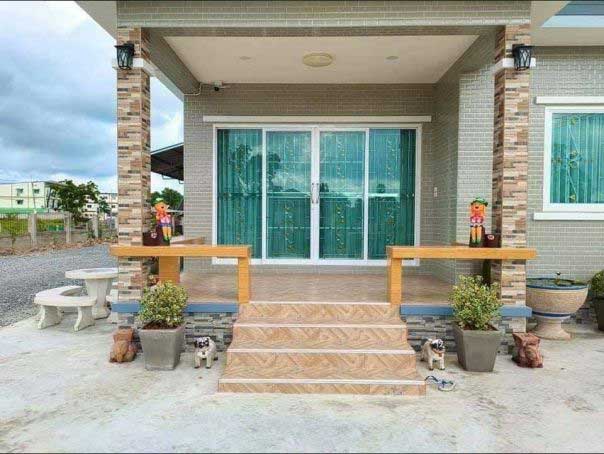 Ngôi nhà giá rẻ được lát đá bậc thềm sang trọng, khuôn viên cây xanh tận dụng diện tích nhỏ phía trước tạo sự gần gũi với thiên nhiên. Cửa kính được sử dụng để lấy ánh sáng tự nhiên mang lại bầu không khí trong lành.