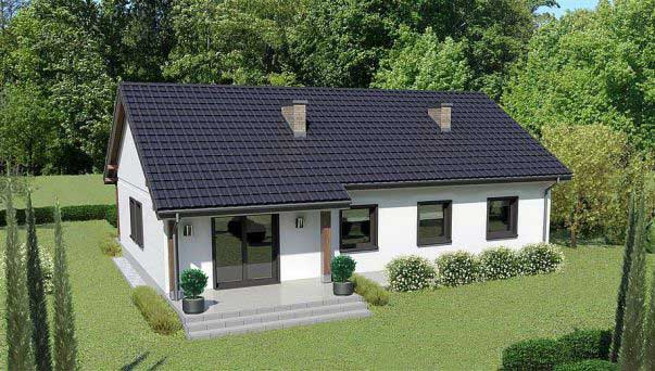 Mẫu nhà cấp 4 2 phòng ngủ sử dụng mái dốc màu nâu và mái dài để tránh mưa nắng chiếu trực tiếp vào cửa sổ trong nhà.