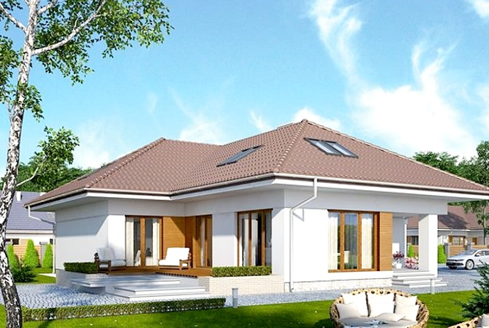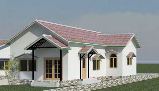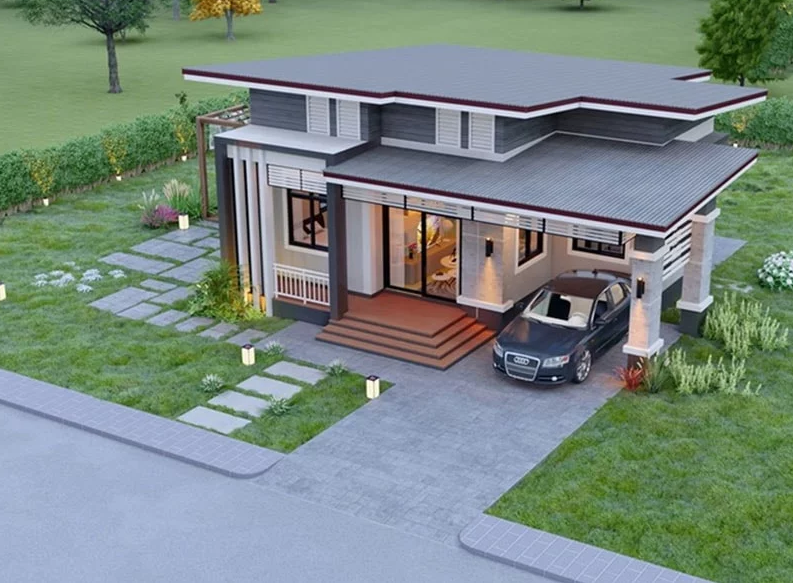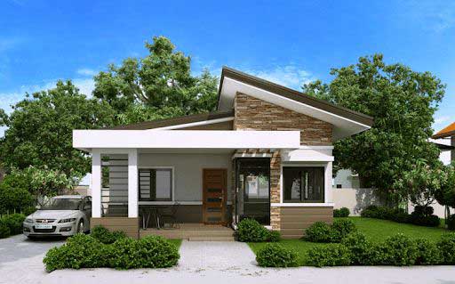 Nếu bạn đang sở hữu một diện tích xây dựng rộng chiều ngang và ngắn ở chiều dài thì phương án phối cảnh trên đây là gợi ý khá phù hợp. Màu sắc đầm thắm đi kèm lối trang trí kẻ sọc ngang quen thuộc bên dưới hệ thống mái thái giật cấp tạo nên nét đẹp quyến rũ cho ngôi nhà trệt.