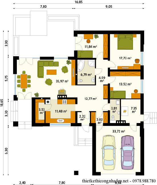 Trong mẫu thiết kế nhà cấp 4 hình chữ L này phần gara xe được thiết kế phía sau nhà, gara xe được thiết kế rất rộng rãi có thể chứa được 2 chiếc ô tô. Mẫu nhà này được thiết kế với 1 phòng khách, 3 phòng ngủ, 1 phòng vệ sinh rất rộng rãi và phòng bếp + phòng ăn. Diện tích xây dựng của nhà cấp 4 hình chữ L là 16,85m x 18,65 m, phần gara để xe dài 6,3 m, nếu diện tích nhà bạn nhỏ hơn thì có thể bỏ phần gara xe này đi cũng được.