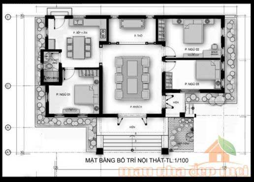 Bản vẽ thiết kế nhà cấp 4 3 phòng ngủ 1 phòng thờ diện tích 100m2. Công năng sử dụng trong ngôi nhà được bố trí gồm các khu vực phòng khách + phòng thờ, 3 phòng ngủ, 1 bếp, 1 WC.