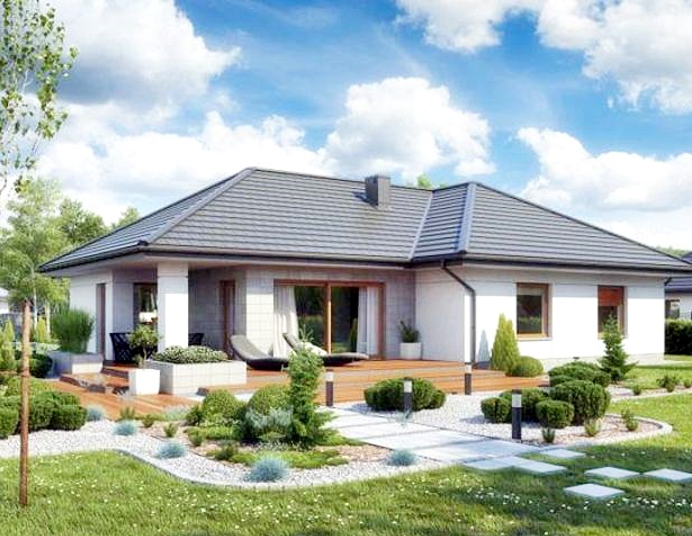 Mẫu nhà cấp 4 3 phòng ngủ chữ L từ lâu đã rất phổ biến và quen thuộc với nhiều hộ gia đình người Việt. Kiểu kiến trúc này không chỉ dễ xây dựng trên khu đất hình vuông, hình chữ nhật, mà còn có thể áp dụng trên khu đất hình thang. Mẫu nhà cấp 4 đẹp với thiết kế độc đáo. Phần hiên được thiết kế khá rộng rãi có thể kê một bộ bàn ghế sofa để ngồi uống trà tại đây. Các bậc thềm xen kẽ nhau tạo điểm nhấn, mang nét sang trọng cho ngôi nhà. Khoảng sân được lát cỏ, tạo không gian xanh, hòa hợp với thiên nhiên