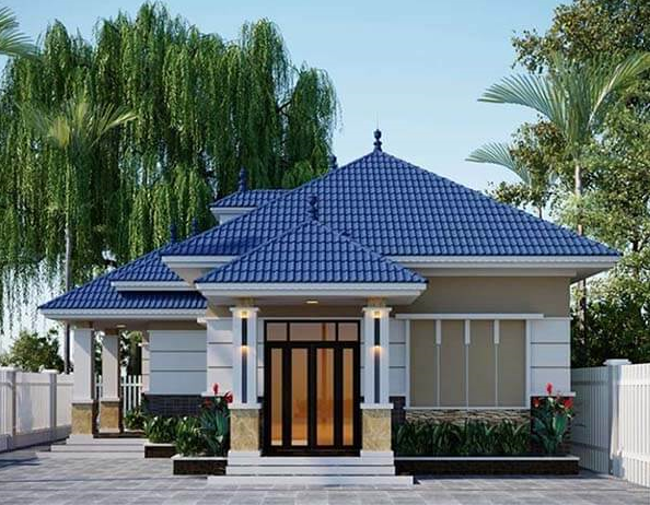 Hình ảnh mẫu nhà cấp 4 100m2 này với thiết kế mái thái màu xanh lam vừa mang nét truyền thống, vừa có sự cải cách về tính hiện đại. Thêm vào đó là các nhấn nhá hoa văn trên tường và dưới chân cột làm nổi bật cho ngôi nhà.