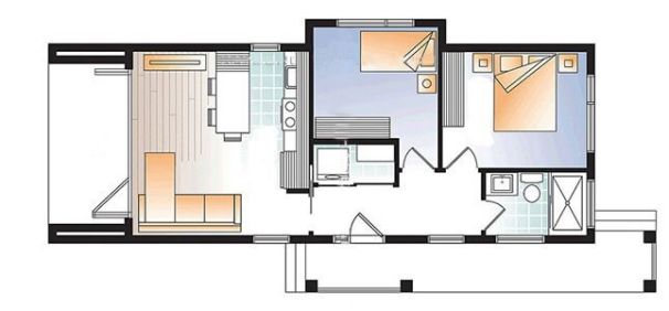 Nội thất trong nhà cũng khá đơn giản. Phòng khách nhỏ và nhà bếp nằm trong khu vực chung. Bàn phòng khách được tận dụng làm bàn ăn giúp tiết kiệm diện tích. Kiến trúc của mẫu nhà này rất coi trọng sự riêng tư. 2 phòng ngủ đủ rộng cho 4 người, chiếm hơn 1/2 diện tích căn nhà. 2 phòng vệ sinh được bố trí bên cạnh 2 phòng ngủ.