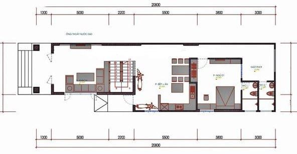 Bản thiết kế đầy đủ công năng tiện ích và hiện đại. Bước vào sảnh chính là phòng khách rộng, được ngăn cách với bếp bằng vách ngăn mỏng. Bàn ăn đối diện với bếp và bên kia đường. Sau đó, có một dãy phòng gồm hai phòng có diện tích bằng nhau. 2 phòng vệ sinh được thiết kế ở phía trước và phía sau của dãy phòng giúp các thành viên trong gia đình sinh hoạt dễ dàng hơn. Cuối nhà có thêm khoảng sân phơi quần áo tận dụng ánh sáng tự nhiên giúp ngôi nhà sáng sủa hơn.