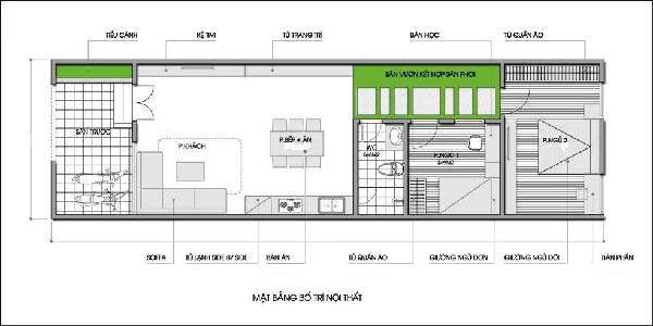 Mặt tiền được chia làm hai không gian bằng nhau, tiện cho việc bố trí không gian song song bên trong. Với phần không gian thứ nhất là khu vực phòng khách, phòng ăn và không gian phòng ngủ. Không gian thứ hai song song với không gian thứ nhất là phòng thờ, phòng ngủ, khu vực bếp ăn và nhà vệ sinh được đặt cuối nhà. Từ vị trí khu vực phòng bếp có lối dẫn ra khu vực sân sau với mục đích để phục vụ việc giặt giũ quần áo của gia chủ. Mẫu nhà này đáp ứng nhu cầu sinh hoạt của gia đình từ 2 đến 4 thành viên.