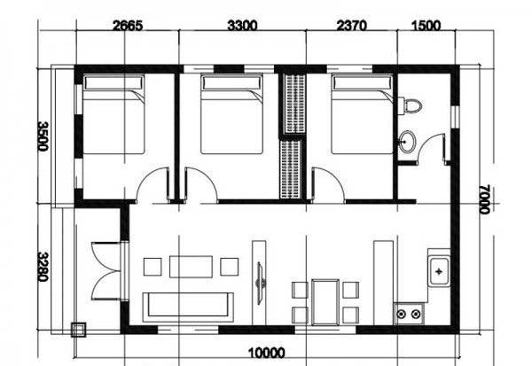 Tương tự như phương án thiết kế phía trên, phần diện tích 7m được chia thành 2 phần tương đương với nhau. Một bên là phòng khách, khu vực bàn ăn và khu vực phòng bếp. Phần còn lại của mẫu nhà cấp 4 7x10 được bố trí 2 phòng ngủ với diện tích kha lớn và nhà vệ sinh được đặt ở cuối nhà. Phía cuối nhà bố trí cửa sau tại khu vực bếp để vừa thông thoáng khí, không gây ám mùi thức ăn lên các không gian phòng bên trên.