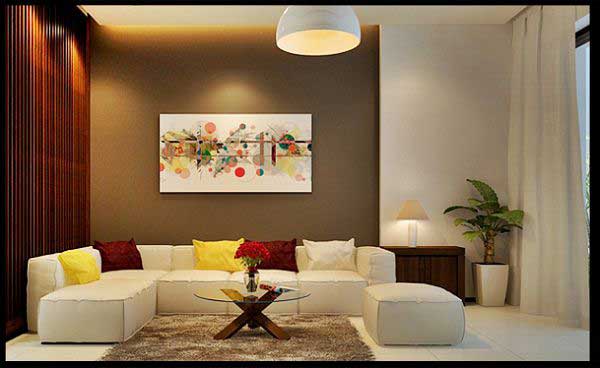Không gian phòng khách lựa chọn 2 tone màu trắng và nâu cùng với ánh sáng đèn vàng, vách ngăn bằng gỗ nâu sậm mang đến tổng thể ấm cúng. Không gian phòng khách sử dụng cửa kính với tấm rèm cửa màu trắng để lấy ánh sáng vào trong phòng để tiết kiệm tối đa được điện năng tiêu thụ. Bộ sofa màu trắng với thiết kế đơn giản, điểm nhấn nằm ở chiếc gối màu vàng, đỏ đô. Điểm nhấn cả căn phòng bức tranh đầy màu sắc phía sau bộ sofa, tấm thảm lông màu sẫm và chậu cây xanh trong nhà.