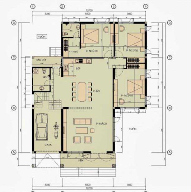 Từ cửa chính nhìn vào là nơi đặt phòng khách, diện tích của phòng này sẽ rộng hơn các phòng khác cũng bởi không gian này được sử dụng nhiều nhất không chỉ cho các thành viên trong gia đình mà còn dành cho cả những vị khách của họ. Phòng khách đặt ở gần cửa chính để thu hút nhiều nhất ánh sáng tự nhiên giúp cho ngôi nhà lúc nào cũng tươi sáng, ấm áo và thoáng mát. Đằng sau phòng khách được bố trí làm phòng bếp với tính năng tiện lợi gọn gàng nhà bếp được lắp một cửa sổ thoát không khí ra bên ngoài để cho không gian không bị ám mùi thức ăn. Đối diện với phòng bếp bên kia chính là phòng ăn, chủ nhà đã khéo tách hai phòng này ra để vừa giúp cho việc ăn uống được thoải mái vừa có thể tận dụng phòng ăn làm nơi học tập làm việc của mọi người.