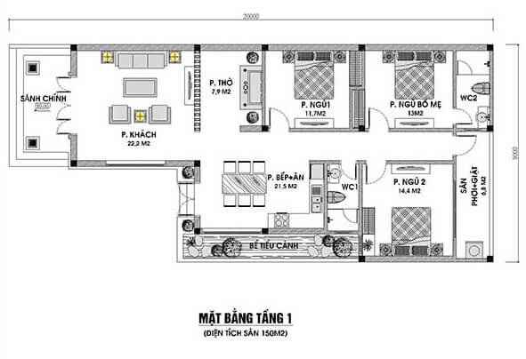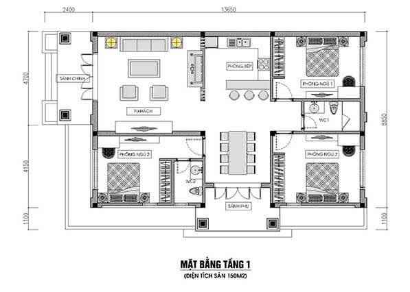 Mẫu nhà cấp 4 diện tích 150m2 có 3 phòng ngủ sang trọng