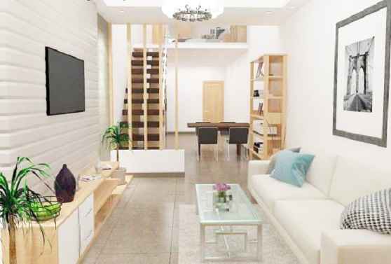 Phòng khách có không gian mở với khu vực phòng ăn và bếp. Cuối nhà sẽ là khu vệ sinh. Bạn có thể sử dụng gác lửng làm phòng ngủ. Với diện tích nhỏ, bạn nên chọn tường và cầu thang màu sáng để căn nhà trông rộng hơn. Ngoài ra, có thể chọn nội thất màu tối. Nhờ sự phối hợp màu sắc hợp lý mà ngôi nhà sẽ trở nên đẹp và ấn tượng hơn