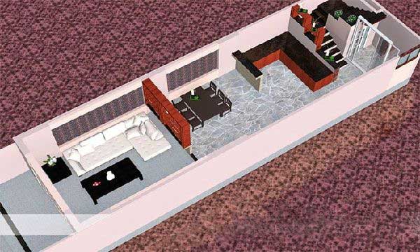 Nhìn vào phối cảnh 3D này ta nhìn rõ hai cửa trước và sau của ngôi nhà gia chủ đều lựa chọn phần cửa kính khung nhôm viền trắng vô cùng nổi bật, lại giúp cho không gian bên trong nhà có thể lấy được nhiều nhất ánh sáng vào ban ngày, giúp gia chủ tiết kiệm được một khoản kha khá. Hơn nữa việc sử dụng hai cửa thông như vậy giúp cho ngôi nhà của bạn lưu thông luồng khí tốt hơn, không ám mùi đồ nấu lên các không gian khác.