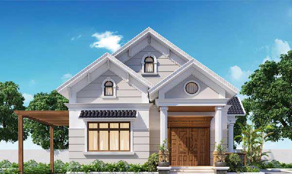 Mẫu nhà cấp 4 70m2 sử dụng hệ thống mái Thái giật cấp kết hợp với phong cách kiến trúc tân cổ điển cũng mang đến cho gia chủ sự sang trọng – Đây cũng là mẫu nhà được gia chủ ưa chuộng hiện nay. Cửa chính được làm bằng gỗ tự nhiên cùng với hoạ tiết gia công bằng tay ở phía trên vô cùng tỉ mỉ. Sảnh chính với hệ thống bậc tam cấp kết hợp hệ thống cột trụ tròn cùng chân trụ vuông vực làm nên sự vững chắc cho ngôi nhà. Đặc biệt kiến trúc mái giả với đặc trưng cửa vòm chính là điểm nổi bật của ngôi nhà này. Đừng bỏ qua chi tiết đường chỉ phào ở bức tường của ngôi nhà cũng là một trong những đường nét của kiến trúc cổ điển.