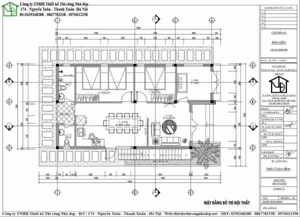 Phòng khách sang trọng của mẫu nhà 8x15m được bố trí phía trước sảnh chính. Phòng bếp và phòng khách được ngăn cách bằng vách ngăn gỗ lịch sự. Phòng bếp kết hợp phòng khách đặc biệt được gia chủ yêu cầu kê một bộ bàn ghế lớn đủ cho hơn 10 người sử dụng. Phòng thờ đặt cạnh phòng ngủ 2 có lối đi ra ngoài rất thuận tiện. Theo mong muốn của gia chủ, 2 khu vệ sinh được đặt đối diện nhau ở khu vực sân sau, có lẽ việc bố trí này là theo thói quen sử dụng của gia đình.