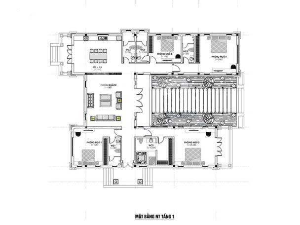 Mẫu bản vẽ chi tiết trên đây chúng ta thấy rõ đây là một mẫu nhà chữ U gồm có 4 phòng ngủ. Từ khoảng sân đi qua sảnh chúng ta vào đến phòng khách tại phòng khách này được bố trí luôn gian thờ rất thuận tiện cho việc thờ cúng được thuận lợi. Phía tay phải của phòng khách là phòng bếp và phòng ăn được thiết kế thông nhau để tạo ra một không gian rộng rãi, thoáng đãng cho toàn bộ phòng bếp.