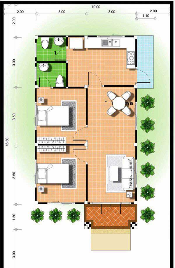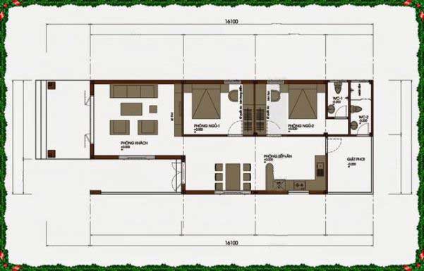 Với chiều sâu 16m chỉ 1 tầng, mẫu nhà đã thể hiện được hết công năng của mình. Kiến trúc gồm: 1 phòng khách, bếp và bàn ăn, 2 phòng ngủ và 2 vệ sinh.