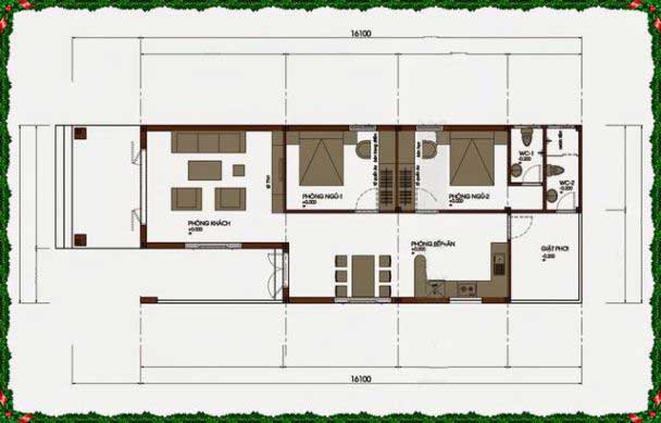 Bản vẽ của ngôi nhà này được thể hiện rõ ràng với các phòng chức năng bao gồm 1 phòng 1 phòng khách, 1 phòn bếp thông với phòng ăn, 2 phòng ngủ và 2 phòng vệ sinh tiện lợi trong sinh hoạt của tất cả các thành viên trong gia đình. Cũng giống như những mẫu nhà cấp 4 truyền thống hay hiện đại thì phòng khách được bố trí đầu tiên. Sau đó đến 2 phòng ngủ và phòng bếp đối diện. Cuối cùng là 2 nhà vệ sinh.