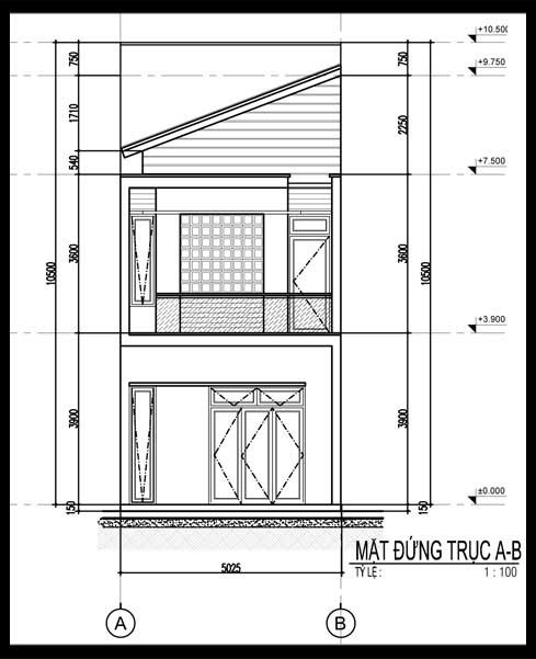 Chủ đầu tư xây dựng ngôi nhà này là anh Lê Thanh Cường, trú quán tại thành phố Đà Nẵng, anh mong muốn thiết kế nhà đẹp 2 tầng mặt tiền 5m độc đáo với mái xéo hiện đại. Diện tích lô đất là 85m2, diện tích thiết kế và xây dựng là 85m2với đầy đủ các công năng như sau: Tầng 1: hiên mặt tiền, phòng khách, phòng ăn, phòng bếp, phòng ngủ, wc chung, nhà kho. Tầng 2 bao gồm 2 phòng ngủ, phòng sinh hoạt chung, wc chung và sân thượng, phòng thờ.