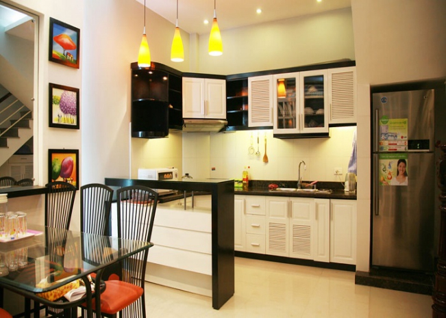Nhà bếp rực rỡ sắc màu của ánh đèn trang trí, của những bức tranh sặc sỡ, đa dạng làm nổi cả căn nhà. Nhờ có sự bày trí nội thất khéo léo mà đồ dùng nhà bếp đâu vào đó, khi tìm kiếm rất tiện lợi. Chắc chắn tất cả các thành viên nhà bạn sẽ đều cảm thấy vui vẻ trong mõi bữa cơm bởi có một căn phòng đáng yêu như thế này.