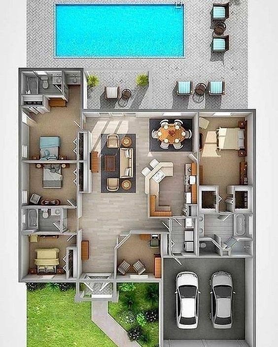 Thông qua bản vẽ thì mọi người cũng thấy được sự hiện đại với cấu trúc tổng quan mang đến những lợi ích dành cho người sử dụng. Phần mặt tiền là hệ thống sân vườn kết hợp gara ô tô để xe với diện tích lớn. Từ cửa chính đi vào là lần lượt 3 phòng ngủ, kèm 2 nhà vệ sinh bên trong. Cạnh cửa chính còn là một không gian riêng mà gia chủ đã sử dụng làm phòng làm việc ngay tại nhà. Kế tiếp là hệ thống bao gồm, phòng khách – nhà bếp- bàn ăn rộng- phòng chứa đồ dùng sinh hoạt. Cuối cùng là mẫu phòng ngủ đẹp, rộng có tích hợp đầy đủ các chức năng riêng với hệ thống được trải dài cho đến gara. Phía cuối ngôi nhà là sân vườn nhỏ là nơi thư giãn cuối ngày một cách hiệu quả.
