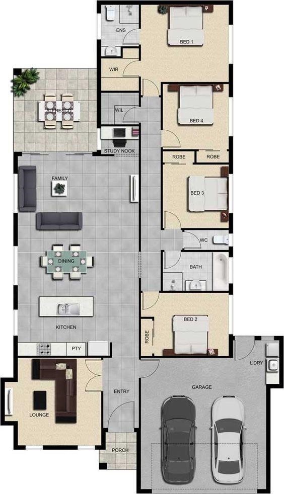Bản vẽ thể hiện việc sử dụng tối đa diện tích đất sẵn có bằng hệ thống nhà để xe nằm về hướng bên phải, theo cửa ra vào chính thì ngôi nhà có 1 phòng tiếp khác bên ngoài. Phần bên trong dùng cho các thành viên sử dụng với một phòng sinh hoạt tập thể gồm : Nhà bếp, bàn ăn, phòng khách và sân vườn phía sau ngôi nhà. Phần còn lại của ngôi nhà sẽ là 4 phòng ngủ được sắp xếp 1 cách liên tiếp tạo nên sự nhất quán trong kiến trúc, điều mà gia chủ đã đưa ra những góp ý trước cho kiến trúc sư.