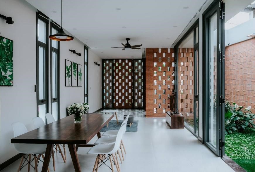 Ở góc chụp rộng hơn, không gian hiện lên màu sắc tươi mới từ nét tổng quan sáng tạo đã được kiến trúc sư sắp xếp một cách hài hòa từ bàn ăn nằm đối diện là khu vực sân vườn ngăn cách bằng một hệ thống cửa sử dụng kính cường lực. Giúp chủ nhà khi sinh hoạt bên trong vẫn có thể hướng mắt nhìn ra ngoài để cảm nhận sự tươi mới bởi năng lượng từ thiên nhiên. Đây có thể coi là sự thành công mà ngôi nhà có thể mang đến cho gia chủ.
