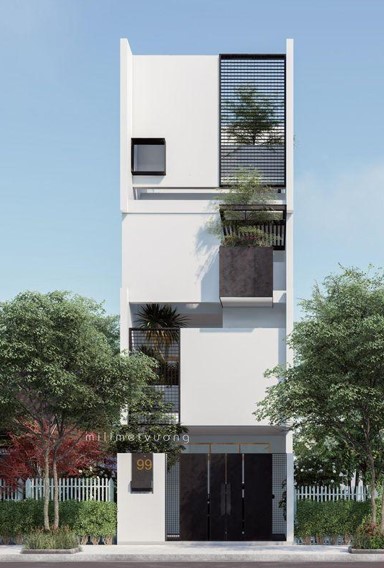 Từ mặt tiền ngôi nhà, bạn hoàn toàn có thể thấy được phong cách mà gia chủ đang theo đuổi. Đúng ! chính là phong cách tối giản mà đã được thông qua ngay từ phía ngoài. Vẫn là các kết cấu thông thương như ban công theo từng tầng, vẫn là các gam trắng được xuyên suốt theo mọi bề mặt của ngôi nhà mà điểm nhấn có thể thấy là các cây xanh phía bên ngoài ban công cùng gam màu đối lập từ hệ thống cửa như hỗ trợ một cách phù hợp cho công trình tránh đi sự nhàm chán.