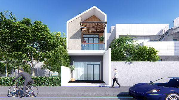 Hình khối tam giác nhưng bố trí lệch nhau mang đến hiệu qảu thẩm mỹ cho mẫu nhà ống 2 tầng 6x15m. Tuy nhiên mặt tiền tầng hai bố trí thoáng hơn khi để không gian mở, cửa kính 3 cánh với ban công bên để gia chủ bước ra ngoài thoải mái ngắm nhìn khung cảnh.