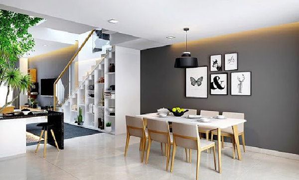 Bàn ăn trong thiết nhà mẫu nhà ống 2 tầng 6x15m cũng được gia chủ lựa chọn với thiết kế đơn giản, không cầu kỳ, phần chân ghế, bàn cũng nhỏ gọn, không chiếm diện tích. Tường tại khu vực bàn ăn lựa chọn tone màu tối với bức tranh đen trắng đơn giản, phần trên trần lắp thêm ánh sáng vàng, và thêm một đèn đơn giản tại khu vực chính giữa bàn ăn. Với cách lựa chọn như vậy đem đến cho gia chủ không gian ấm áp, phù hợp với gia đình cùng nhau tụ tập bên mâm cơm gia đình.
