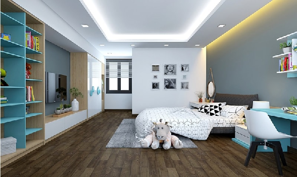 Ngoài việc sử dụng tone màu trắng, căn phòng này còn kết hợp thêm sắc xanh tinh nghịch của các bé trai và thêm cả màu của gỗ. Vẫn là trần thạch cao kết hợp hệ thống đèn led sáng trắng nhưng kèm theo ánh sáng vàng ở khu vực giường ngủ mang đến đa dạng trong màu sắc, phù hợp với chủ nhân là những cô cậu bé sử dụng căn phòng.