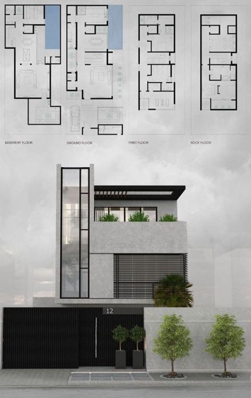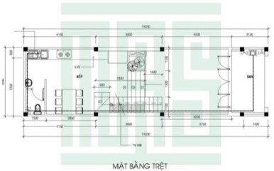 Mặt bằng tầng trệt : Từ hệ thống cửa ra vào, không gian được hiện lên với một khoảng sân rộng phía trước, một không gian sinh hoạt chung và có thể sử dụng chúng như gian phòng để tiếp khách. Kèm 1 nhà bếp và 1 nhà vệ sinh nằm ở cuối ngôi nhà.
