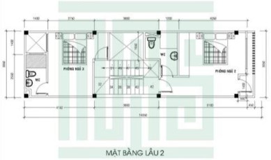 Mặt bằng lầu 2: Gian nhà được thông lên bằng một hệ thống cầu thang khi chia đều phía hai bên là 2 phòng ngủ với 1 nhà vệ sinh được kết hợp bên trong và 1 nằm ở phía ngoài.