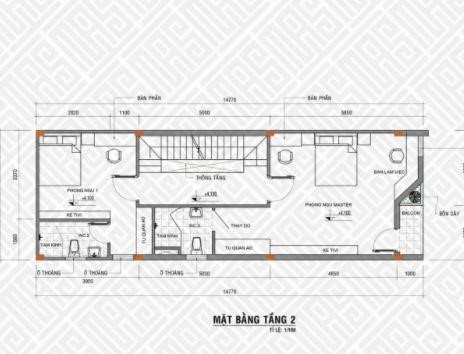 Mặt bằng tầng 2: Chức năng được thay đổi từ không gian sinh hoạt chung thành các chức năng riêng biệt khi bản vẽ thể hiện gồm 2 phòng ngủ nằm đối diện nhau. Khi phần phòng ngủ phía trước có phần rộng rãi hơn rất thích hợp dành cho các cặp vợ chồng và phòng còn lại sẽ sử dụng cho các bé để tiện cho việc chăm sóc.
