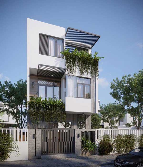 Mẫu nhà phố 5x12 nổi bật bởi gam màu trắng nhã nhặn, nhẹ nhàng kết hợp cùng các chi tiết màu tối trên ngoại thất tạo nên sự tương phản, mới mẻ cho căn nhà. Mặt tiền có sân khá rộng nên thuận tiện cho việc để xe cũng như các phương tiện đi lại hàng ngày được bảo đảm an toàn, an ninh. Thiết kế lam chắn ở ban công và sân giúp lượng ánh nắng không hắt quá nhiều vào nhà mà vẫn hấp thụ được nguồn sáng đi vào phía bên trong. Cách bố trí 2 cổng cũng rất tiện, vì cổng lớn để di chuyển xe ô tô vào nhà và cổng phụ thuận tiện cho việc đi ra vào bên trong căn nhà. Nhìn chung, căn nhà mang tới đầy đủ các công năng hữu ích mà các hộ gia đình ngày nay rất cần thiết trong cuộc sống hàng ngày.