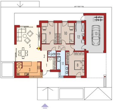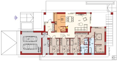 Thông qua bản vẽ thiết kế phía trên, gia chủ đã được thừa hưởng sự tính toán từ sự sáng tạo và đổi mới một cách độc đáo từ đơn vị thiết kế với một công trình tiện nghi nhất. Phần chính giữa của ngôi nhà là hệ thống gồm 3 phòng ngủ 1 nhà vệ sinh phụ và 1 chính kèm các tiện nghi đầy đủ. Thông qua bên trái là gian phòng sinh hoạt chung với các chức năng kèm theo với phòng khách, nhà bếp, bàn ăn khá rộng rãi từ diện tích và gian nhà cuối cùng là hệ thống gara được kết hợp bên trong kiến trúc.