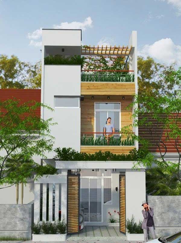 Nổi bật với gam màu trắng chủ đạo kết hợp cùng các mảng màu tối của chi tiết ngoại thất, căn nhà 2 tầng 5x20 mang tới nét đẹp trẻ trung và hiện đại. Có sân rộng và thoáng mát là một ưu điểm, có thể để xe và các phương tiện đi lại hàng ngày. Tầng trên được thiết kế có ban công nhỏ, còn lại là lam chắn và ngoại thất khá đơn giản và đã được tối ưu. Cổng được lắp đặt hệ thống cửa sắt chống gỉ, các bức tường rào đổ bê tông có khối xám khối trắng đan xen nhau tạo nên sự tương phản. Nhìn chung, căn nhà xây dựng rất đẹp lẫn về kiến trúc và thẩm mỹ, là sự lựa chọn không thể từ chối cho các hộ gia đình ngày nay.