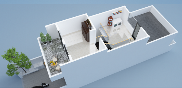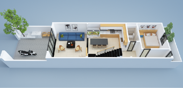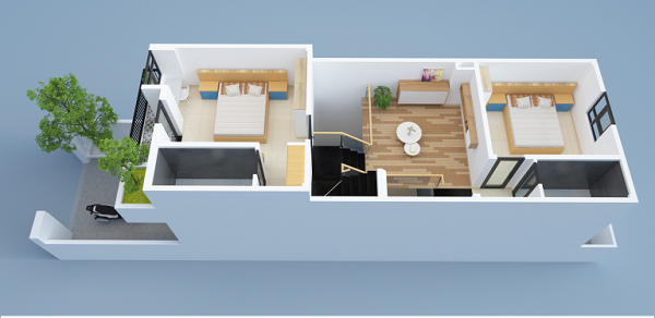 Ở không gian tầng một để để khoảng không gian với chiều sâu đúng tiêu chuẩn để làm gara oto là 5m, tiếp đến là khu vực phòng khách, phòng bếp kết hợp bàn ăn, 1 phòng vệ sinh nhỏ và một phòng ngủ nhỏ, phía sau là tiểu cảnh xanh. Khu vực cầu thang được bố trí song song với khu vực bếp ăn tạo nên không gian thông hai không gian với nhau hoặc có thể sử dụng cầu thang ngăn cách khu vực phòng khách và khu vực bếp với nhau.