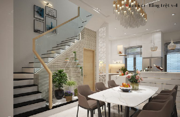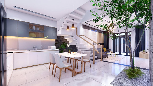 Thêm một tiểu cảnh cây xanh được bố trí để tạo khoảng xanh cho không gian trống dưới chân cầu thang giúp không gian nhà bếp xanh, mát và trở nên rộng hơn rất nhiều.