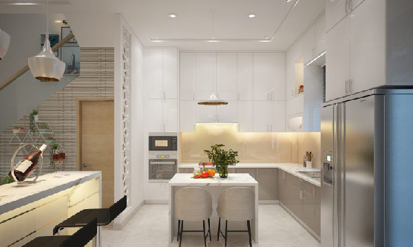 Phần tủ bếp được bố trí với phần tủ có gỗ có màu trắng, không họa tiết, kết hợp phần ánh sáng được bố trí hợp lý giúp căn bếp trở nên rộng rãi hơn rất nhiều. Từng khu vực được phân chia theo từng tính năng sử dụng khoa học hợp lý, tạo nên không gian sử dụng linh hoạt.