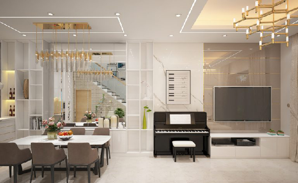 Lựa chọn thứ hai cho thiết kế nhà theo phong cách hiện đại. Vẫn là tone màu trắng được sử dụng và phòng khách thông với phòng bếp nhưng không gian này gia chủ không sử dụng chất liệu gỗ trong thiết kế của mình. Điểm nhấn chính là khu vực tường gạch ốp trắng, kết hợp bức tranh rừng cây chuyển màu vàng, kết hợp với đèn chùm kích thước lớn với thiết kế mới lạ giúp không gian ngôi nhà trở nên lung linh hơn, có phần sang trọng hơn khi xuất hiện ánh vàng lấp lánh.
