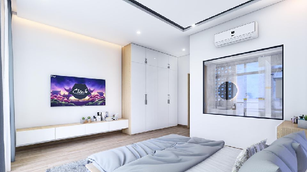 Hệ thống tủ, kệ tivi được thiết kế vừa khít với nhâu để không tạo ra bất kỳ một khoảng không gian thừa nào trong ngôi nhà. Nhà vệ sinh với thiết kế cửa sổ kính cùng tấm rèm cuốn hiện đại hiện nay giúp nhà vệ sinh không bị bó hẹp trong 4 bức tường. Hệ thống chiếu sáng là những bóng đèn led được bố trí xung quanh khu vực trung tâm của căn phòng giúp ánh sáng không quá lớn, vừa đủ, giúp gia chủ có giấc ngủ ngon và yên tĩnh.