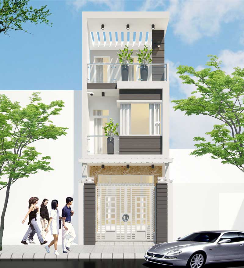Với mặt tiền hẹp, dáng đất hình chữ nhật đúng kiểu đặc trưng nhà phố nội đô. Rất nhiều gia đình muốn sở hữa ngôi nhà kiểu Pháp hiện đại, và điều này hoàn toàn có thể thành hiện thực được. Như mẫu nhà này được thiết kế tinh tế với những trụ cột thẳng đứng đẹp mắt trấn giữ mặt tiền tầng 2 và tầng 3. Hệ thống đường phào chỉ đơn giản, kết hợp cùng chút hoa văn nhẹ nhàng, uyển chuyển phân bố đều khắp các tầng, từ mặt tiền ngôi nhà cho đến phần mái. Mặt bằng phần mái được trang trí đẹp mắt với hệ thông thanh lam ngang dọc màu trắng, cùng với khối trụ trang trí đẹp mắt, hình khối đăng đối, khỏe khoắn tạo sự thu hút cho ngôi nhà. Mọi kiến trúc ngoại thất đẹp mắt, nhẹ nhàng, tôn lên sự sang trọng khác biệt so với mẫu nhà phố khác, mà không hề có cảm giác hình khối quá đồ sộ như những mẫu nhà biệt thự tân cổ điển phương tây thường thấy.