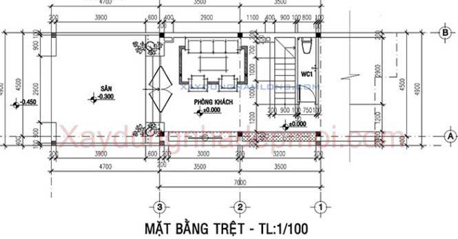 Trong bản thiết kế nhà phố, tầng trệt là tầng tách biệt và mang nhiều tính năng cũng như đa dạng căn phòng nhất từ: sân trước, phòng khách, phòng WC đều được thiết kế một cách hòa hợp, mang lại sự tiện lợi tối đa. Chiều dài của ngôi nhà được thiết kế 11,7m, với diện tích này có thể dành một khoảng sân trước thoáng mát và tiện ích cho cả ngôi nhà.